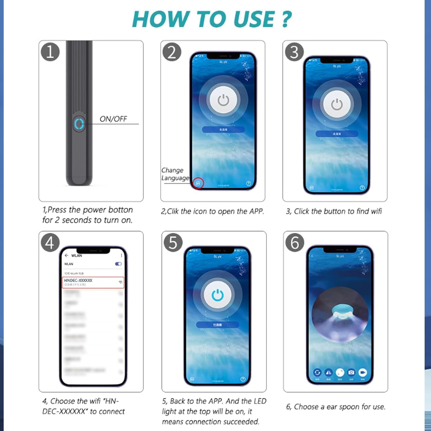 Intelligent Visible APP: Wi-Fi directly connects the ear scope device and the application. Ear-care cleaning you can see on your phone screen, supports taking pictures and recording videos, and features a real-time view via 30fps rate transferring between the ear scope and the phones/tablets whether iOS or Android.